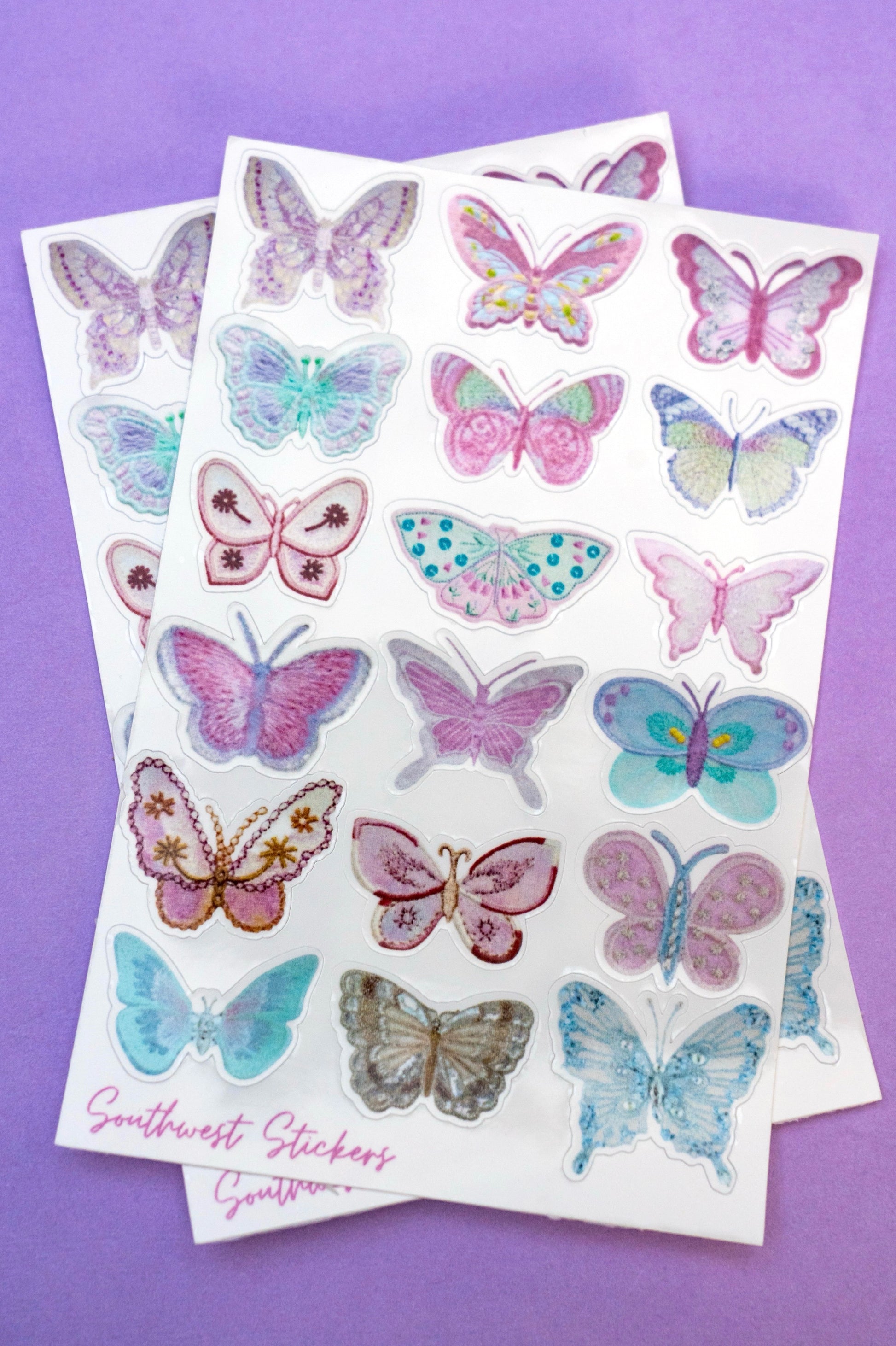 This butterfly sticker sheet features a curated collection of intricately designed butterfly decals, ideal for enhancing planners, scrapbooks, and craft projects. Each sticker showcases detailed patterns and vibrant colors, providing a professional touch to your creative work. Durable and easy to peel, these stickers are perfect for your scrapbook, junk journal, planner, or wherever else you would like to use them!